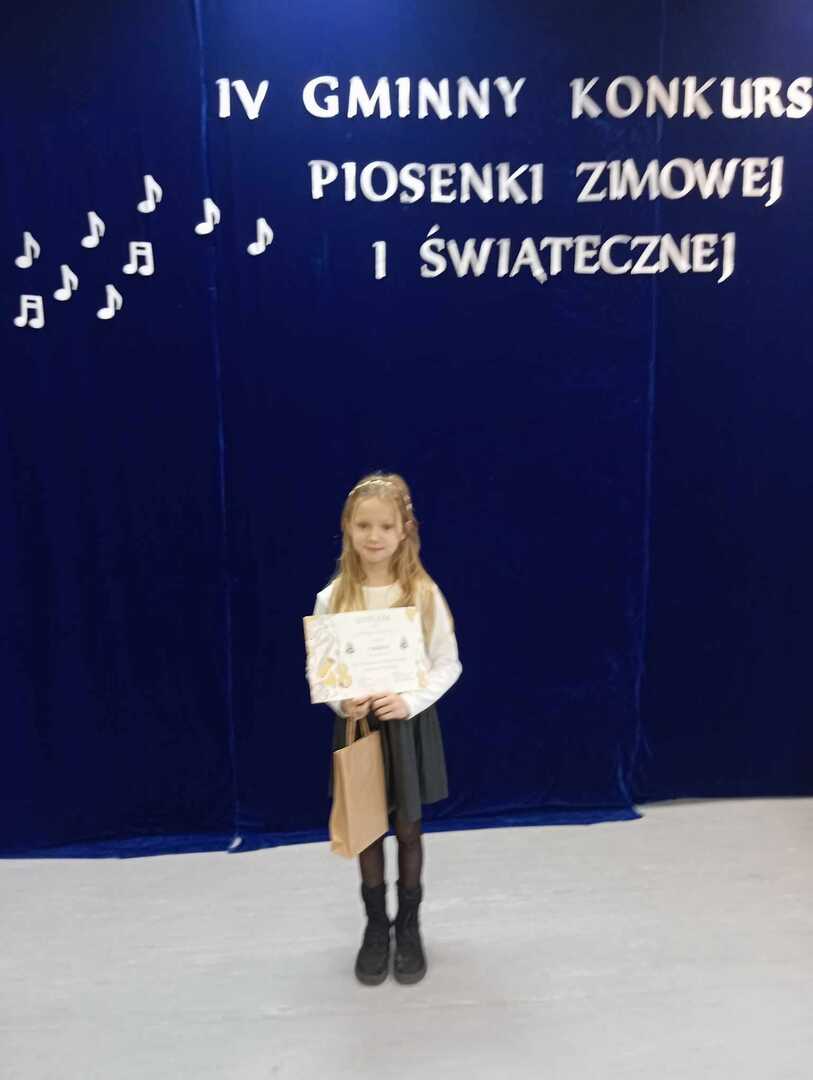 Uczennica klasy trzeciej zajęła pierwsze miejsce w kategorii klas I-IV w Gminnym Konkursie Piosenki Zimowej i Świątecznej. Konkurs odbył się 31 stycznia w Szkole Podstawowej w Sławoszewie z siedzibą w Parzewie. Serdecznie gratulujemy naszej zdolnej wokalistce oraz wuchowawczyni, za przygotowanie swojej artystki do występu.