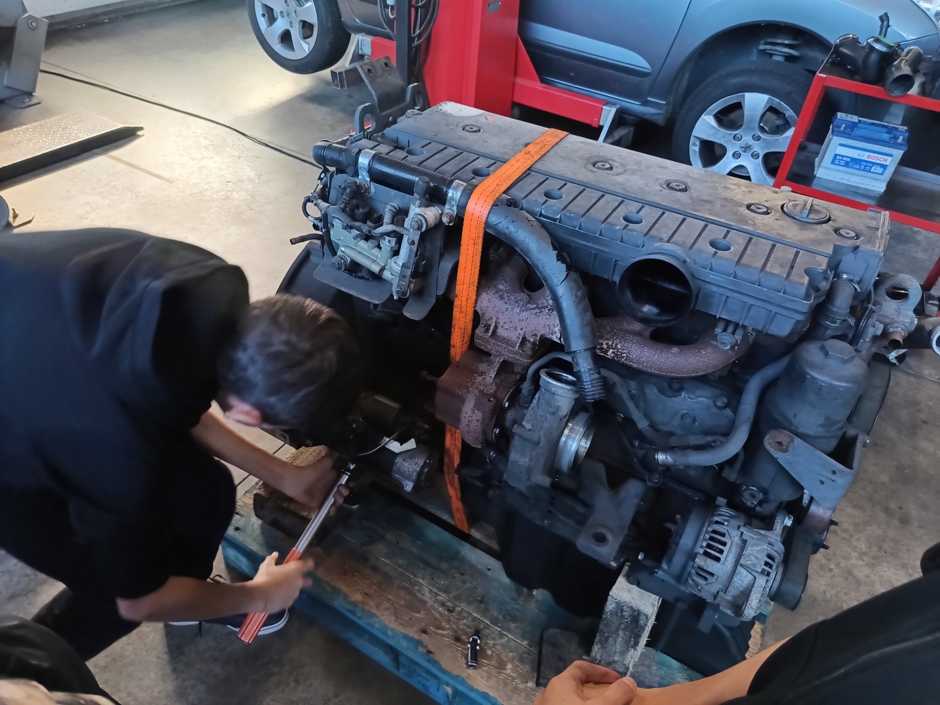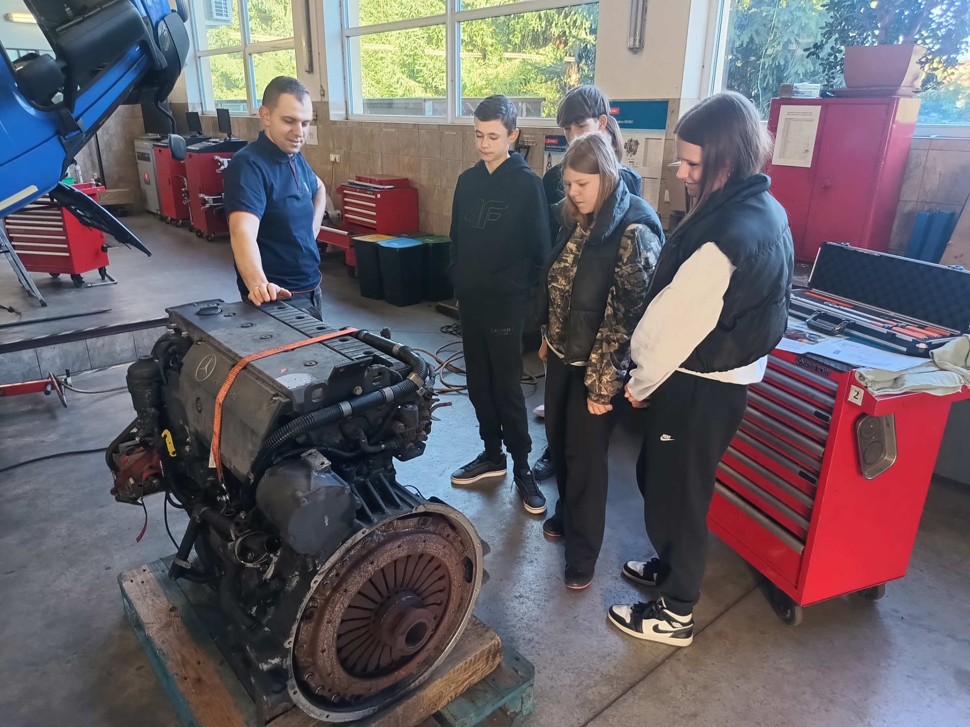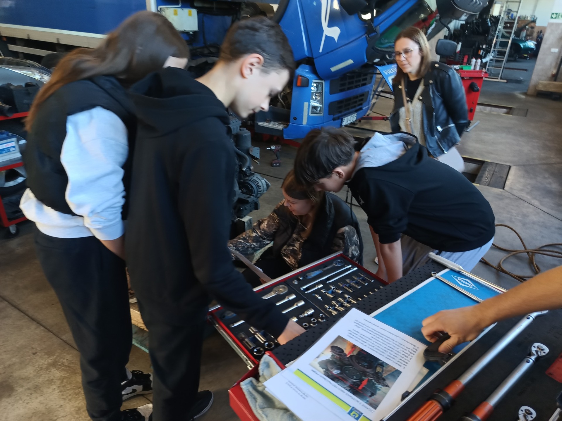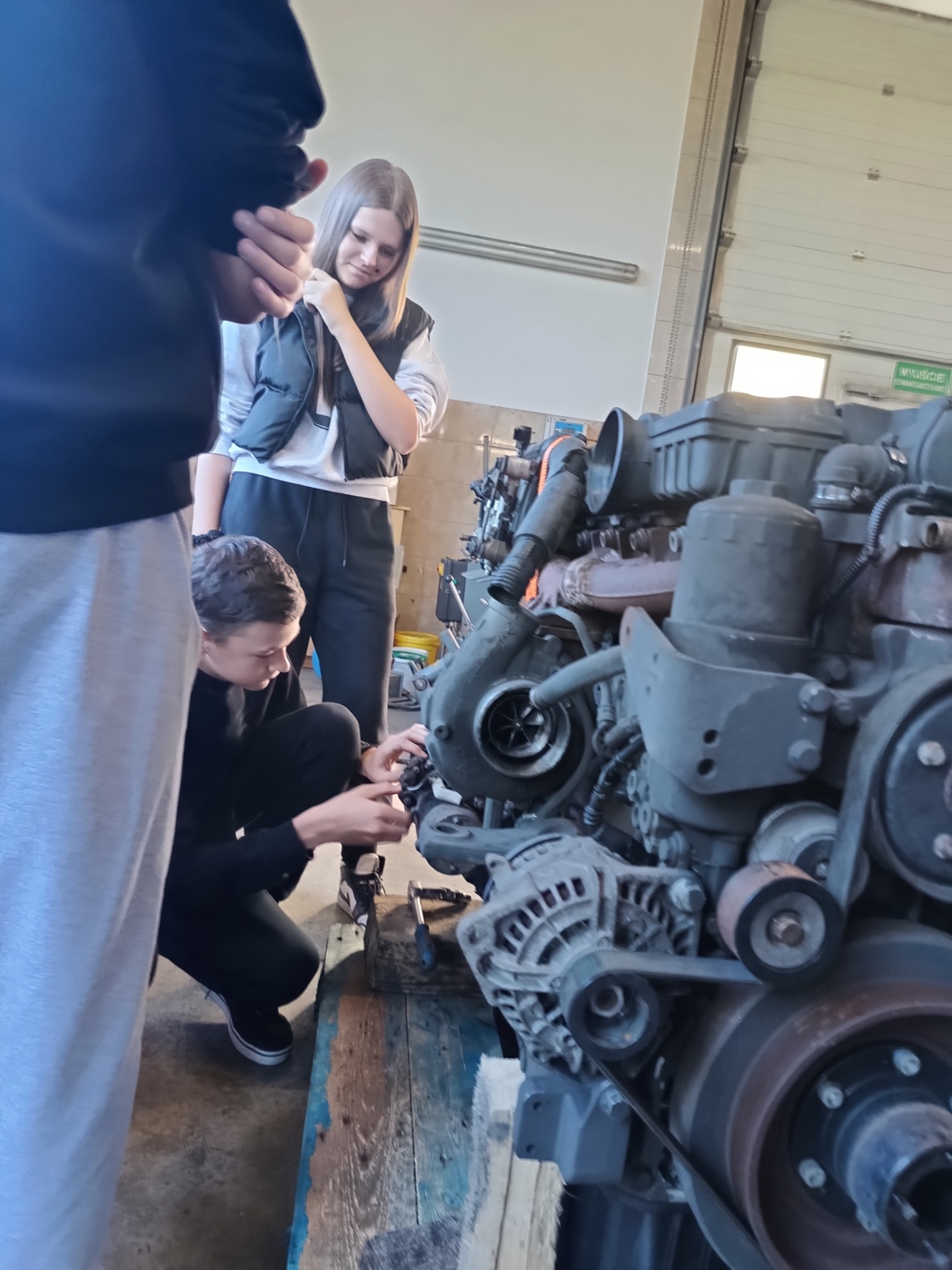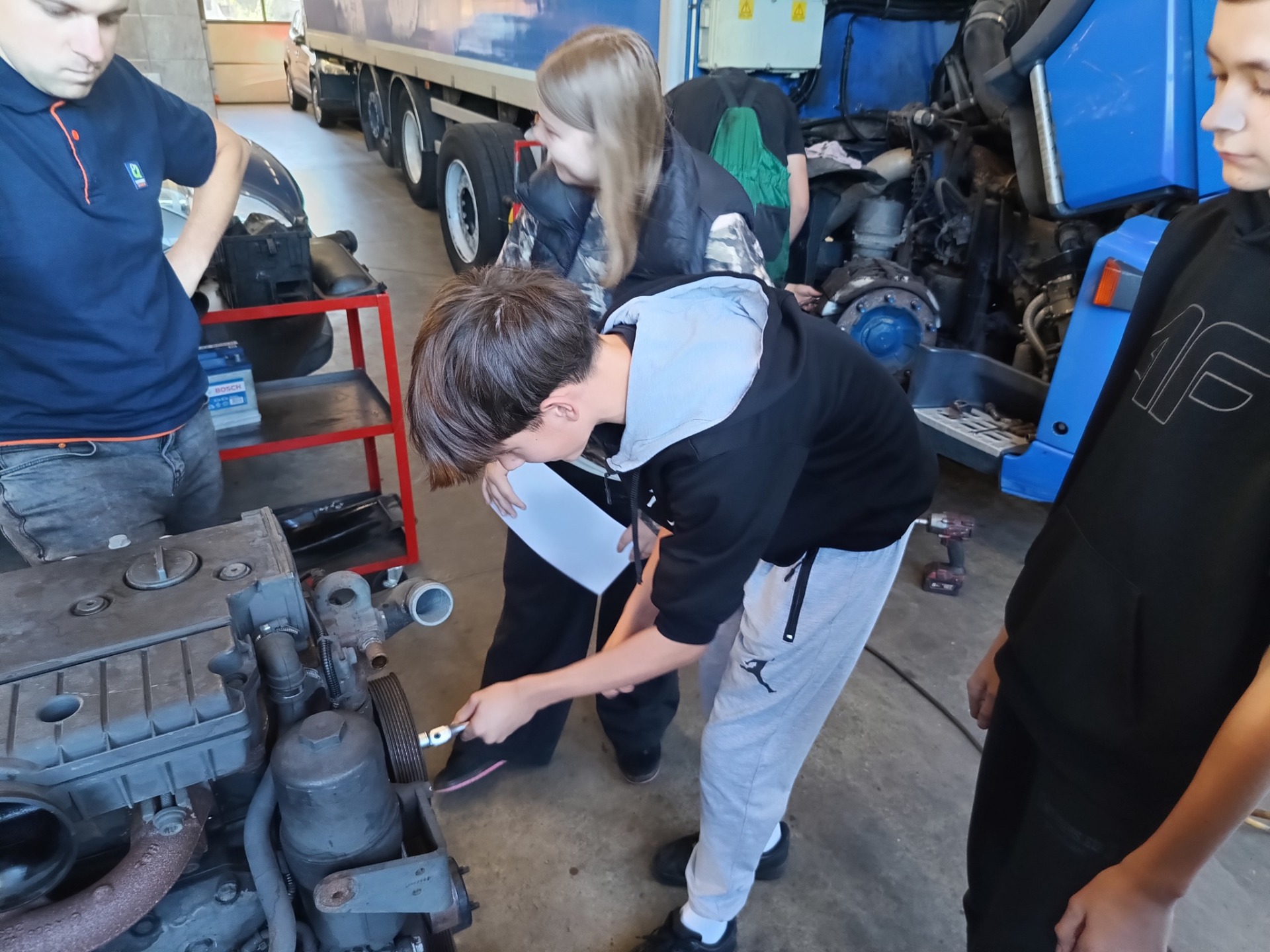 Pierwszym odwiedzonym miejscem był zakład mechaniki pojazdowej. Właściciel firmy przedstawił zakres działalności zakładu, oprowadził uczniów po jego terenie oraz przygotował dla nich praktyczne zadanie polegające na demontażu i ponownym montażu elementów silnika według określonej instrukcji.