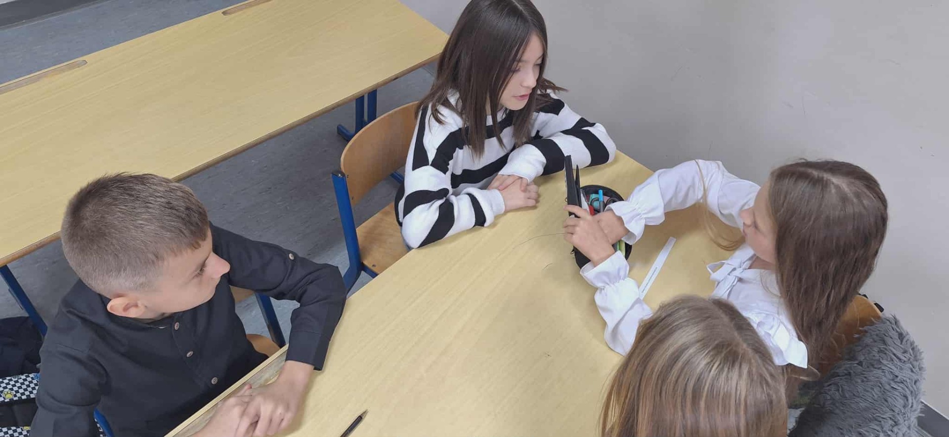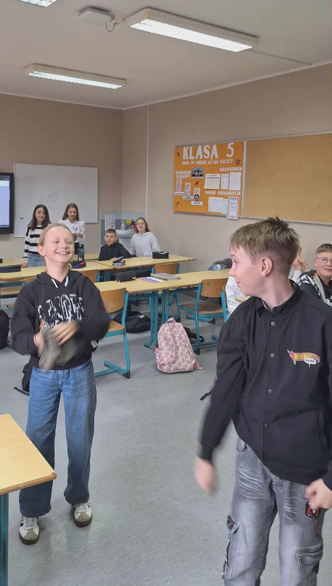 Uczniowie klasy 5 podczas lekcji wychowawczej rozmawiali o tym ważnym temacie i wzięli udział w ćwiczeniu: najpierw odegrali scenkę pokazującą problem, a następnie przedstawili, jak można dobrze zareagować – stanąć w obronie kolegi/koleżanki, powiedzieć coś wspierającego czy zgłosić sytuację dorosłemu.