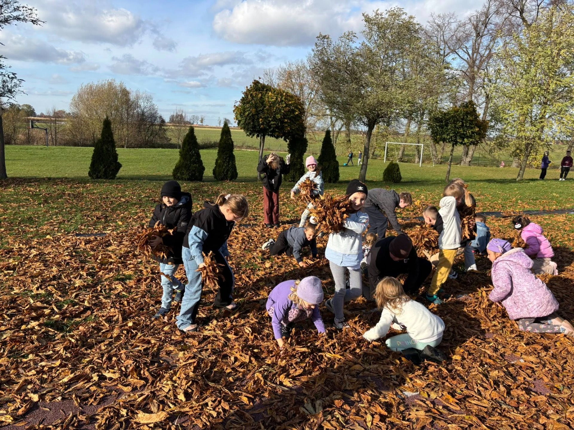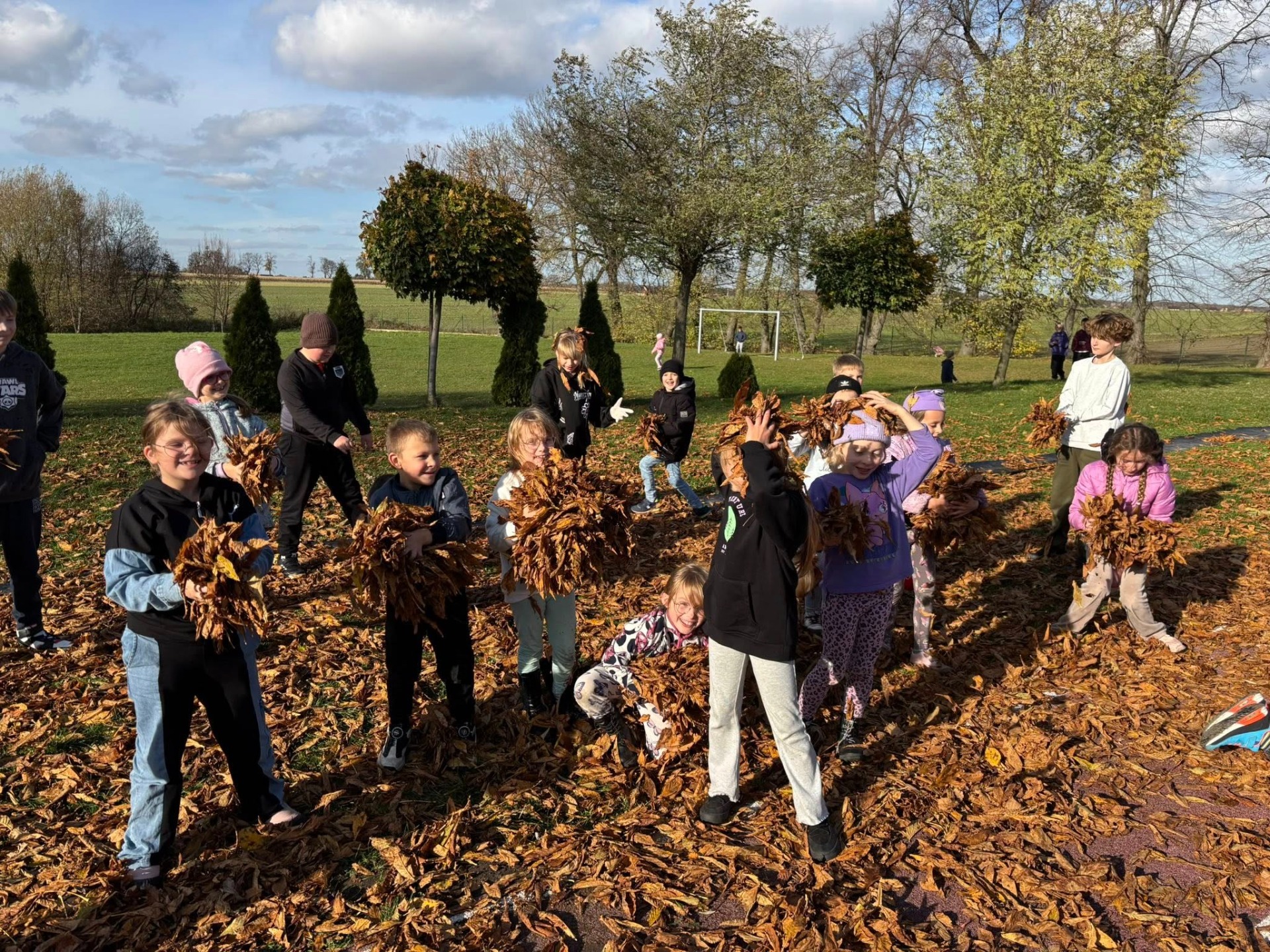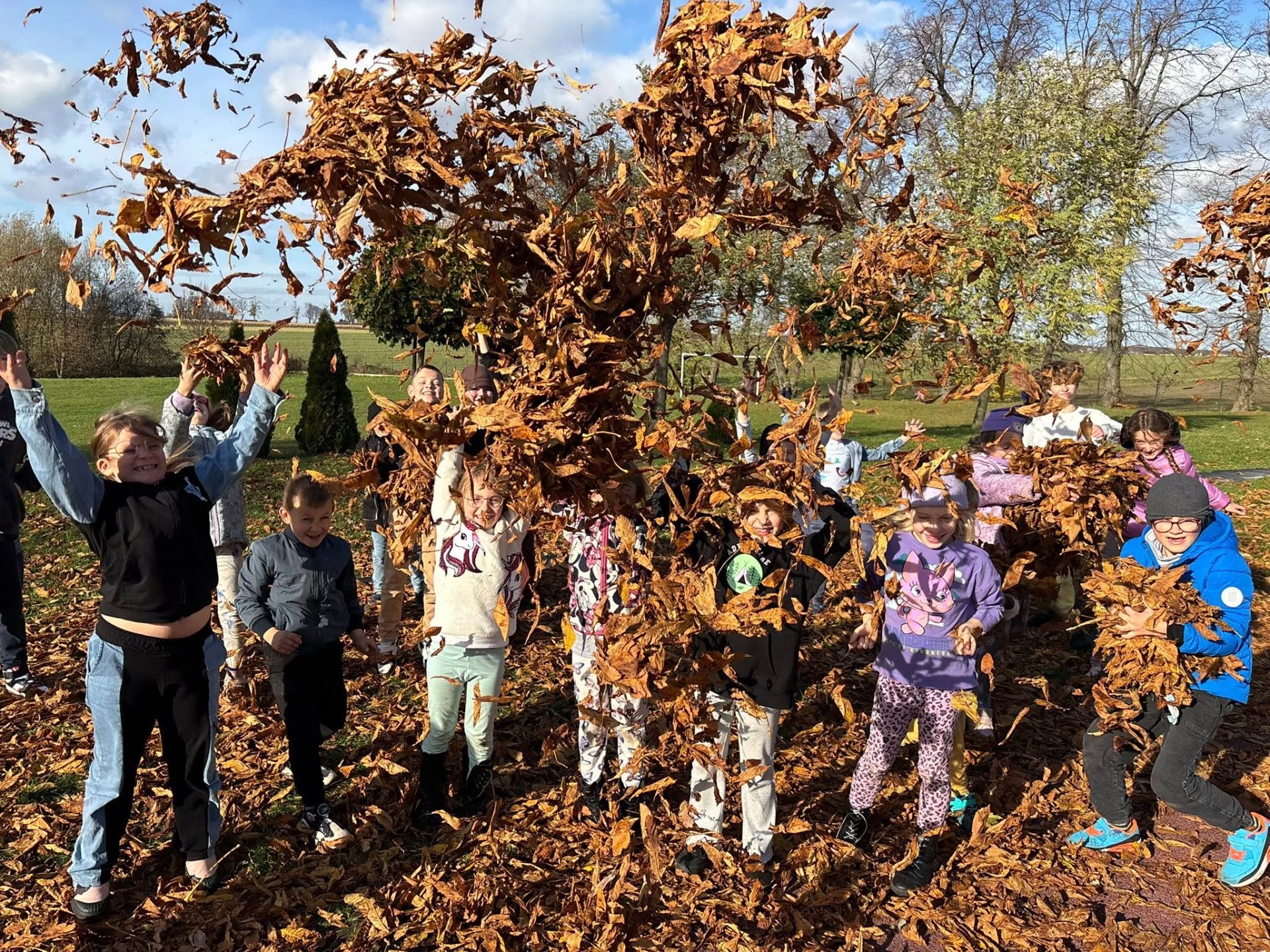 Podczas piątkowych zajęć świetlicowych młodsi uczniowie wykorzystali dary natury – kolorowe, jesienne liście. Korzystając z przepięknej pogody typowej dla polskiej złotej jesieni, zajęcia odbyły się na świeżym powietrzu. Dzieci bawiły się w promieniach słońca, wsłuchując się w szelest liści i ciesząc się urokami jesiennego dnia