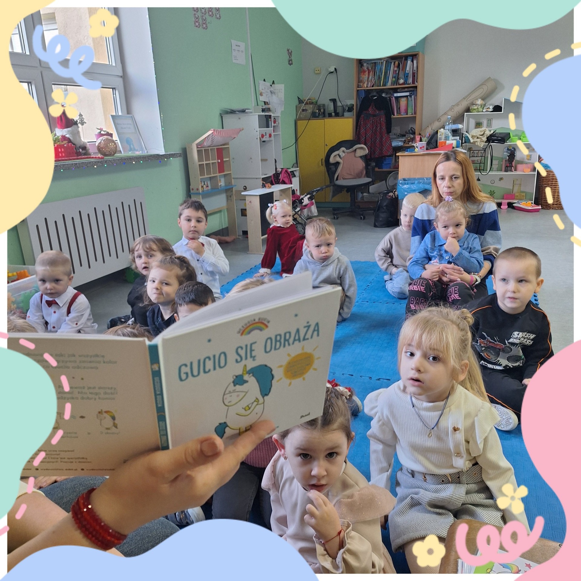 Międzynarodowy Projekt Edukacyjny „ Kolorowe Uczucia Gucia” został zrealizowany tym razem z przedszkolakami z grupy „Koale”. Dzieci z zaciekawieniem wysłuchały bajki „Gucio się obraża”, omówiliśmy wspólnie jakie uczucia przeżywał bohater, wykonaliśmy ćwiczenia oddechowe odganiające ciemną chmurę obrazy a na koniec zajęć zrobiliśmy piękne prace plastyczne